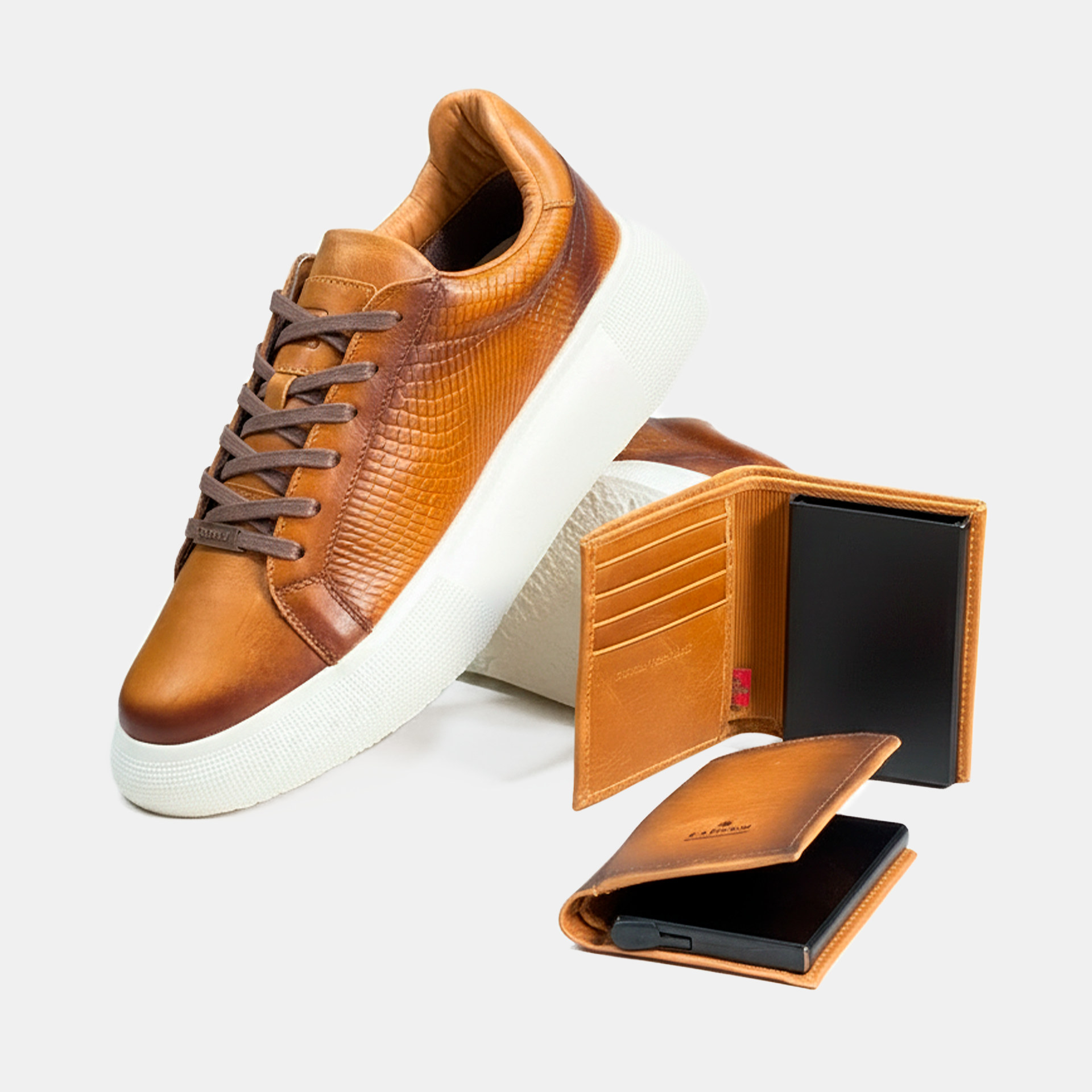 KIT CABERNET CUERO MIEL + BILLETERA ANTIRROBO / ENVÍO GRATIS
